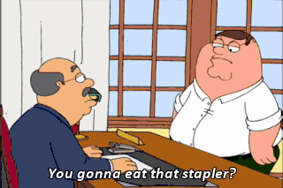 You gonna eat that stapler? You can't eat a stapler-- Wanna split it? Sorry, Chris. Me and my damn appetite!
