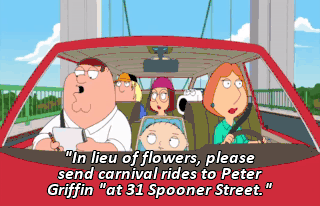 "In lieu of flowers, please send carnival rides to Peter Griffin "at 31 Spooner Street." If we get just one ride out of this, it will have been a success.