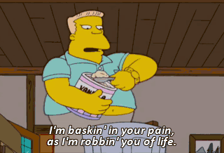 I'm baskin' in your pain, as I'm robbin' you of life. (SLURPING) TAB: Bart! Son, I'm gonna tell you a story about a young man who came here and failed.