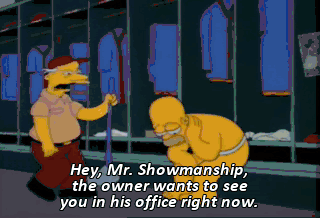 Hey, Mr. Showmanship, the owner wants to see you in his office right now.