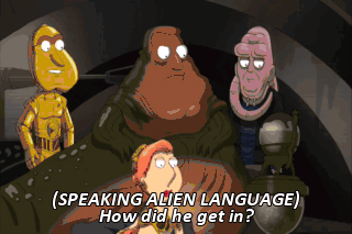 (SPEAKING ALIEN LANGUAGE) How did he get in? (GROWLING) I let him in. What, was that not cool? Nice to see you, Jabba. (IN ALIEN LANGUAGE) (AUDIENCE LAUGHING)