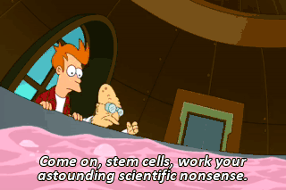 Come on, stem cells, work your astounding scientific nonsense. Fetal stem cells? Aren't those controversial? In your time, yes, but nowadays, shut up!