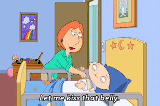- Let me kiss that belly. - Stop it! Cut it out! I'm gonna give you a flubber kiss. Oh, Lois, that tickles! Flubber-belly, pork-belly Stewie. (BLOWS RASPBERRY) Give me that belly! Oh, my God!