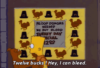 Twelve bucks ! Hey, I can bleed. Hey, you've gotta be 18 to sell your blood. - Let's see some I.D. - Here you go, doll face. - Hmm. Okay, Homer. just relax. - Ow ! At the risk of losing my voice,