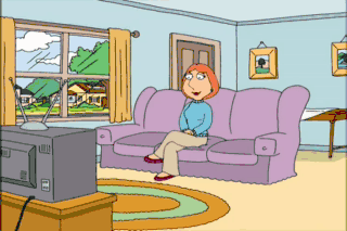 Hey, you. The news is on. Oh. Where is everybody? Stewie's taking a nap, and Peter and the kids are out. Come sit with me. O-Ok.