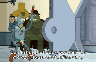 Don't shut that door, partner. I'm a crazy Texas robot millionaire,