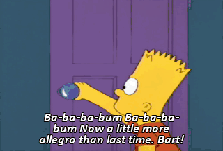 Ba-ba-ba-bum Ba-ba-ba-bum Now a little more allegro than last time. Bart! Welcome. Can I offer you a diet caffeine-free Dr. Pepper... or an individual fruit cocktail cup?