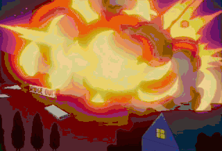 It blew up the bridge! We're doomed! It's times like this I wish I were a religious man. It's all over, people! We don't have a prayer!