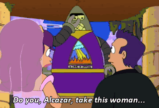 Do you, Alcazar, take this woman... Poorer, in sickness, to love, death, part? Yeah, sure, I do. Come on-- faster! Do you, Leela, copy and paste his response till death do you part? I... d--