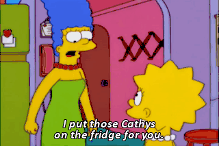 I put those Cathys on the fridge for you. I don't even like them. They've gotten so smutty. Oh, sure. When a man does it, it's smutty. But if a woman did it--