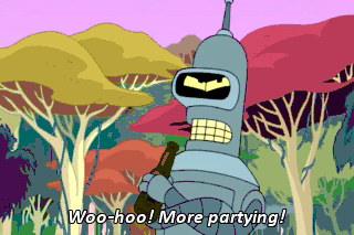 Woo-hoo! More partying! (BEAT BOXING) Quiet, Bender. Cut it out. (BELCHES) Bender! Shut the hell up! (POWER SURGING)