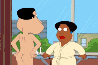 (GRUNTS) You go on and beat it, little neck! I'm a changed woman! I don't mess with your kind anymore! You're a meanie! (CRYING) Hey, Quagmire. Hey, Cleveland. Why are you staying in a hotel?