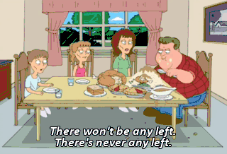 There won't be any left. There's never any left. (GASPING) Happy Thanksgiving. (SOBBING) Mom, why is the cable guy here? It's me, you guys. and I have something to tell you all.