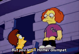 But you let in Homer Glumpet. It says "No Homers." We're allowed to have one. I felt so left out. Kids can be so cruel. We can? Thanks, Mom!