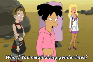 What? You mean along gender lines? Gender? Yeahs. You knows, guyses, galses, in that order.
