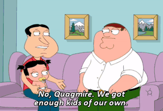 No, Quagmire. We got enough kids of our own. Plus old Brian over there. Right, buddy? I sharpened a pencil in my bum and now I need a Band-Aid. You're doing the right thing, Quagmire.