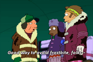 Good way to avoid frostbite, folks-- put your hands between your buttocks. That's nature's pocket. Uh, I think I'll go check on Bender. Watch that he doesn't pick your pocket.
