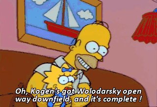 Oh, Kogen's got Wolodarsky open way downfield, and it's complete !