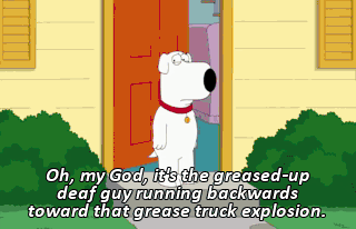 Oh, my God, it's the greased-up deaf guy running backwards toward that grease truck explosion. The grease burns so bad! I can't hear! Boy, I am late for that meeting. (GROANS) Come on, math, you dick.