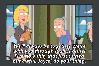We'll always be together We're with you through it all Channel Five Holy shit, that just turned out awful. Joyce, do your thing.