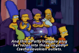 And this is Patty trying to plug her razor into those ungodly Czechoslovakian outlets. As you can see, we never got the hang of it. Ay, caramba! As I stared at that hairy drumstick I knew I needed a drink.