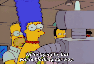 We're trying to, but you're blocking our way. Danger! Danger! Don't forget to pick up pamphlets. I'll handle this.