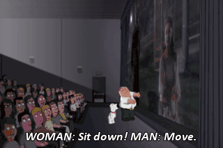 WOMAN: Sit down! MAN: Move. Stop blocking the screen, you jerk! I don't think you heard me, buddy. Step away from the young lady. Mmm!