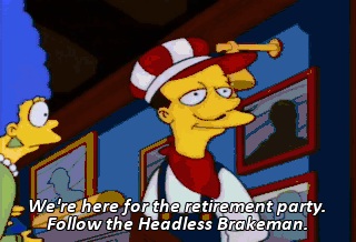 We're here for the retirement party. Follow the Headless Brakeman. Power plant retirement party-- Ow!-- right this way. Tonight, we've all come to honor a close friend of ours. Boring!