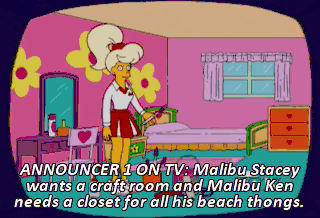 ANNOUNCER 1 ON TV: Malibu Stacey wants a craft room and Malibu Ken needs a closet for all his beach thongs.