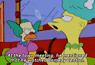 At the town meeting, he mentioned that he watched Comedy Central. I made sure to note that, as it seemed quite unusual. Ye gods! To the police station, Krusty!