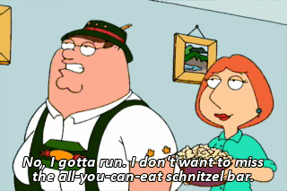 No, I gotta run. I don't want to miss the all-you-can-eat schnitzel bar. Wait a minute! I love schnitzel!