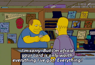 I'm sorry. But I'm afraid your card is only worth everything I've got! Everything! Take it! Oh, no! I've smudged it with nacho fingers. I must deftly lick it off. Deftly... Thank you!