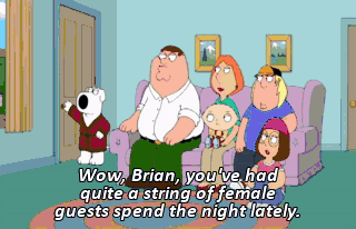 Wow, Brian, you've had quite a string of female guests spend the night lately. Yeah, whatever you're doing, it's working. You should see the way I have to pick up chicks. Hi. (GIGGLING)