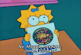 No, Maggie, not Aztec. Olmec. "Ol-mec."