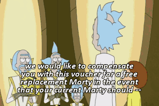we would like to compensate you with this voucher for a free replacement Morty in the event that your current Marty should -- Uh, guys, not a good time. Come on, Morty. Let's hit it,