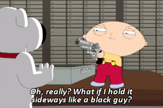 Oh, really? What if I hold it sideways like a black guy? Come on, man. Take it easy, all right? I don't want any trouble.