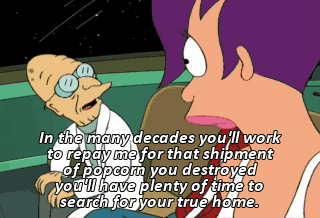 In the many decades you'll work to repay me for that shipment of popcorn you destroyed you'll have plenty of time to search for your true home.