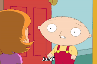 Julie! Hi! We were just talking about you. Hi. Do I know you? Oh, right. Yeah, no, you don't, you know Karina. I'm her brother, Stewie.