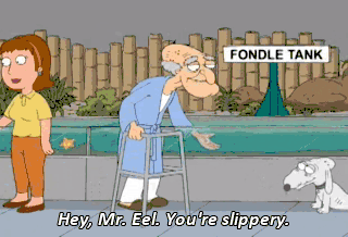 Hey, Mr. Eel. You're slippery. Oops, got away. Mmm. Left my hand smelling funny. Come here, Jesse. Smell my finger. Mmm. Mmm.