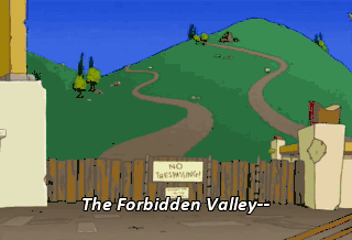 The Forbidden Valley-- A holy sanctuary where no one may tread. Is that anything like a cemetery? 'Cause I got to take a leak. Ow! Fry, that's offensive to our people. Isn't it? Ow.