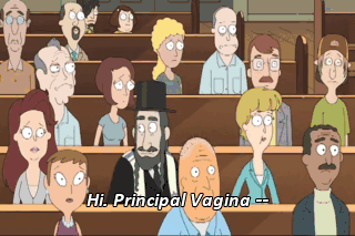 Hi. Principal Vagina -- the name's real, possibly Scandinavian. I'm just gonna come out and make this pitch -- the old gods are dead. Fuck all previous existing religions. All hail the one true God --