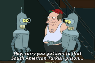 Hey, sorry you got sent to that South American Turkish prison... instead of me on account of mistaken identity. You bastard! They treated me like an animal! And that's what I became!