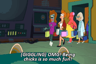 (GIGGLING) OMG! Being chicks is so much fun! Now when I say stupid things, guys all laugh and buy me stuff.
