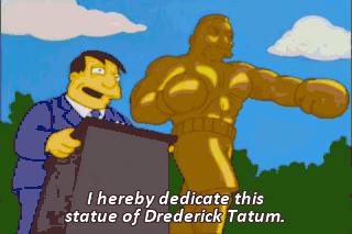 I hereby dedicate this statue of Drederick Tatum. Litter is my most treacherous foe. I would like to eat its children. So long, suckers! Ooh! My mouth. My beautiful mouth.