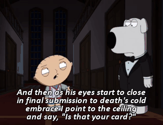 And then as his eyes start to close in final submission to death's cold embrace I point to the ceiling and say, "Is that your card?"