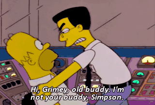 Hi, Grimey, old buddy. I'm not your buddy, Simpson. I don't like you. In fact, I hate you. Stay the hell away from me-- Because from now on, we're enemies.