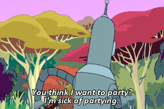 You think I want to party? I'm sick of partying. Woo-hoo! More partying! (BEAT BOXING) Quiet, Bender. Cut it out. (BELCHES) Bender! Shut the hell up!