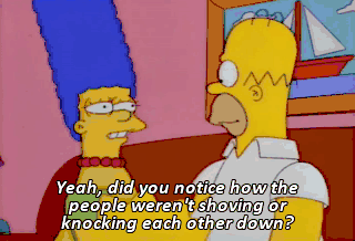 Yeah, did you notice how the people weren't shoving or knocking each other down? I've never been to a place like that before. Ow!