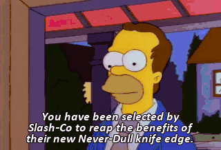 You have been selected by Slash-Co to reap the benefits of their new Never-Dull knife edge. Here. Shake hands with the Slash-Co. Handle first, handle first.