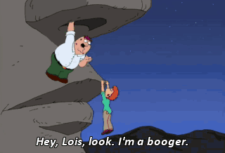 Hey, Lois, look. I'm a booger. Peter, for God's sake! Oh, Ok, Ok. Grab my hand. And now, Mr. Griffin, I want that film. Oh, Sure. It's, uh, right over there in President Rushmore's mouth.